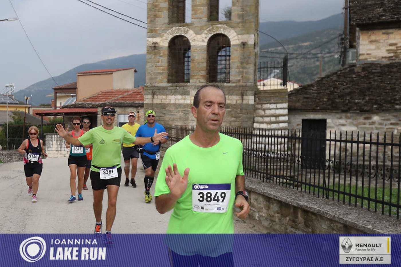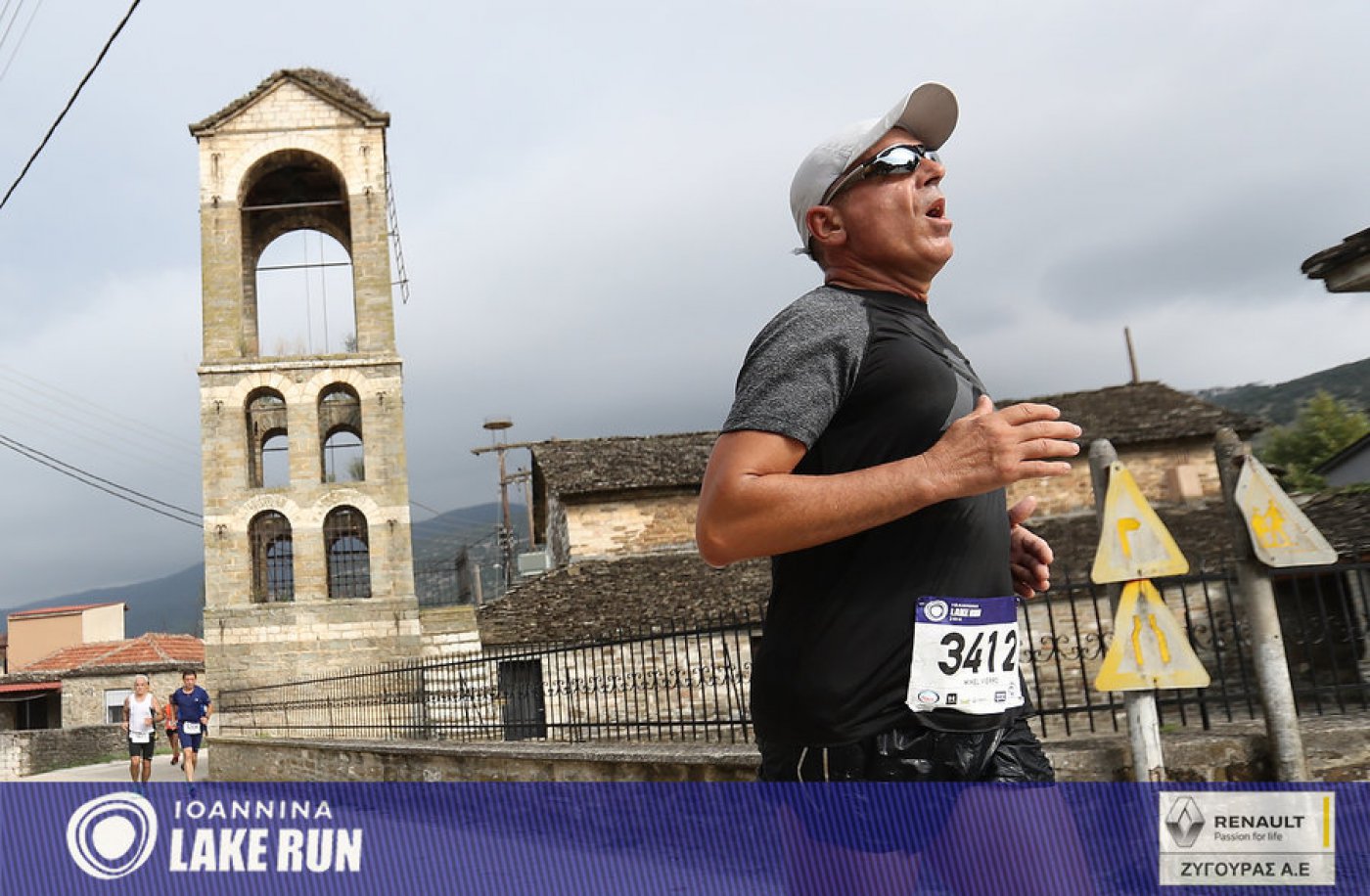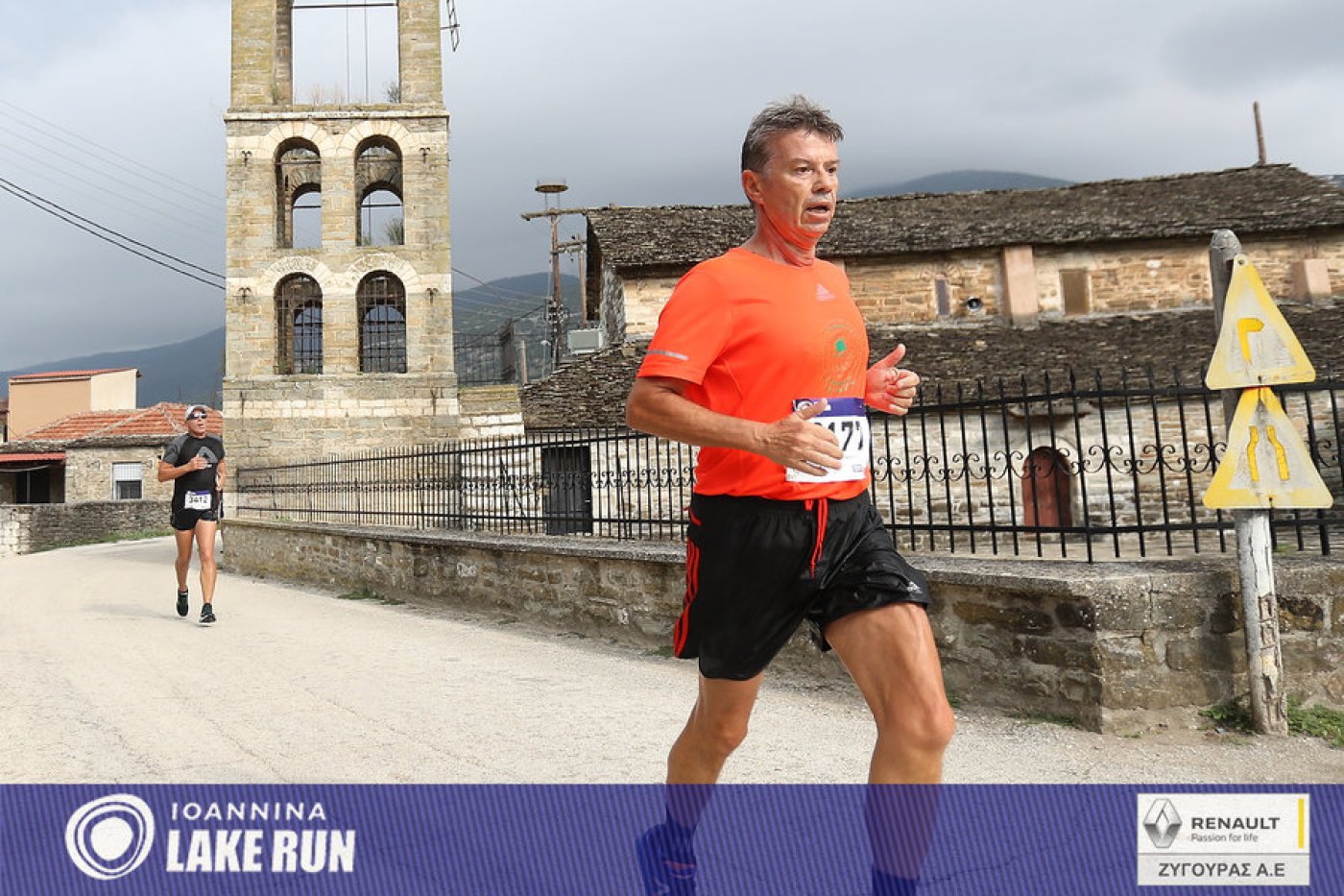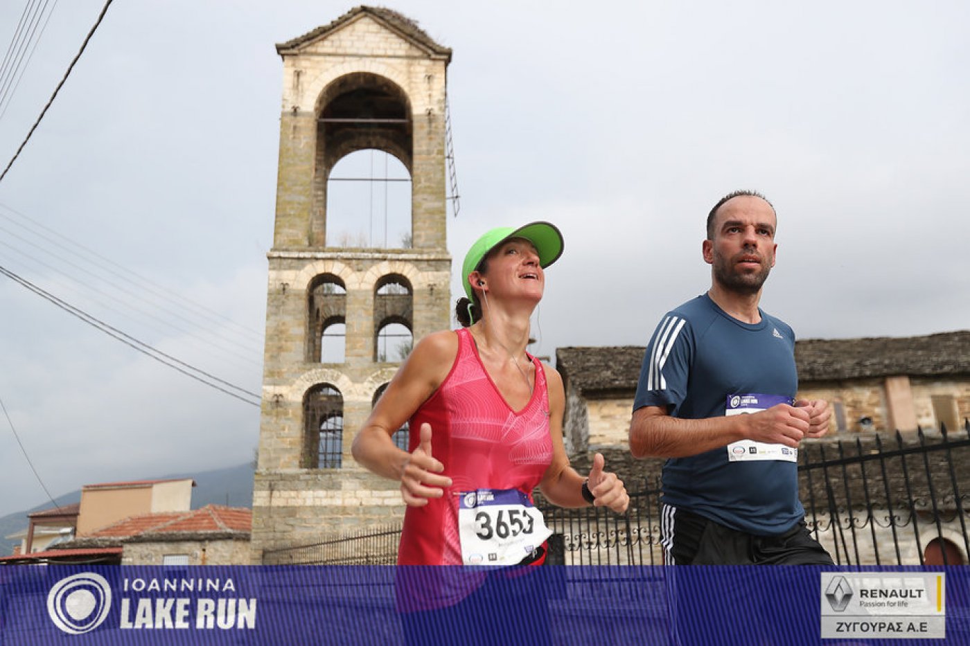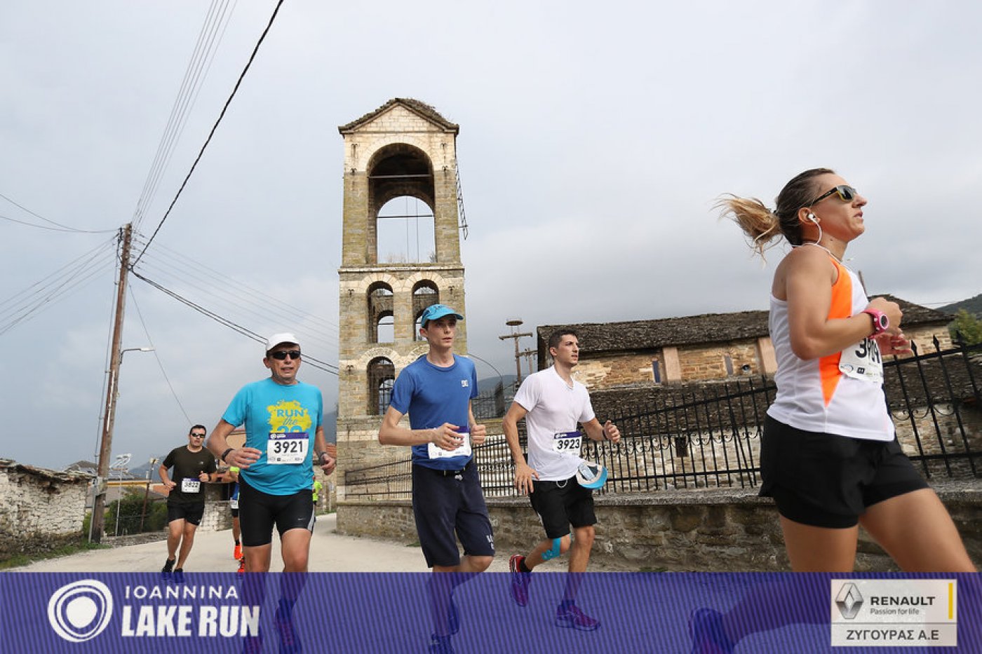 Το πέρασμα των δρομέων από τον παραλίμνιο οικισμό των Λογγάδων και το καμπαναριό της εκκλησίας της Κοίμησης της Θεοτόκου. Εικόνες από τη διαδρομή έξω από τα χωριά της Βασιλικής και της Κατσρίτσας έως την είσοδο στον παραλίμνιο πεζόδρομο-ποδηλατόδρομο.