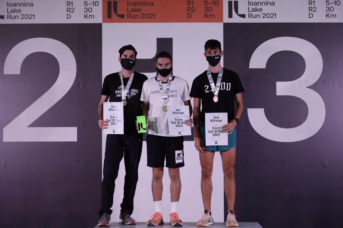 Στο νήμα κρίθηκε ο αγώνας των 5 χλμ. που άνοιξε το αγωνιστικό διήμερο του Ioannina Lake Run 2021, με τρεις αθλητές να δίνουν μάχη σώμα με σώμα καθ’ όλη τη διάρκεια της διαδρομής.