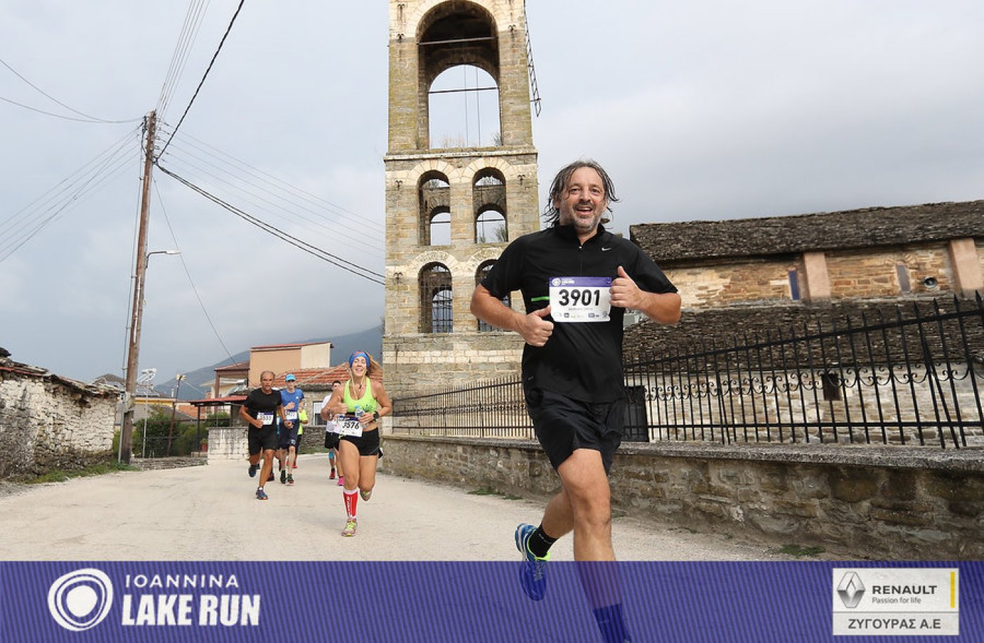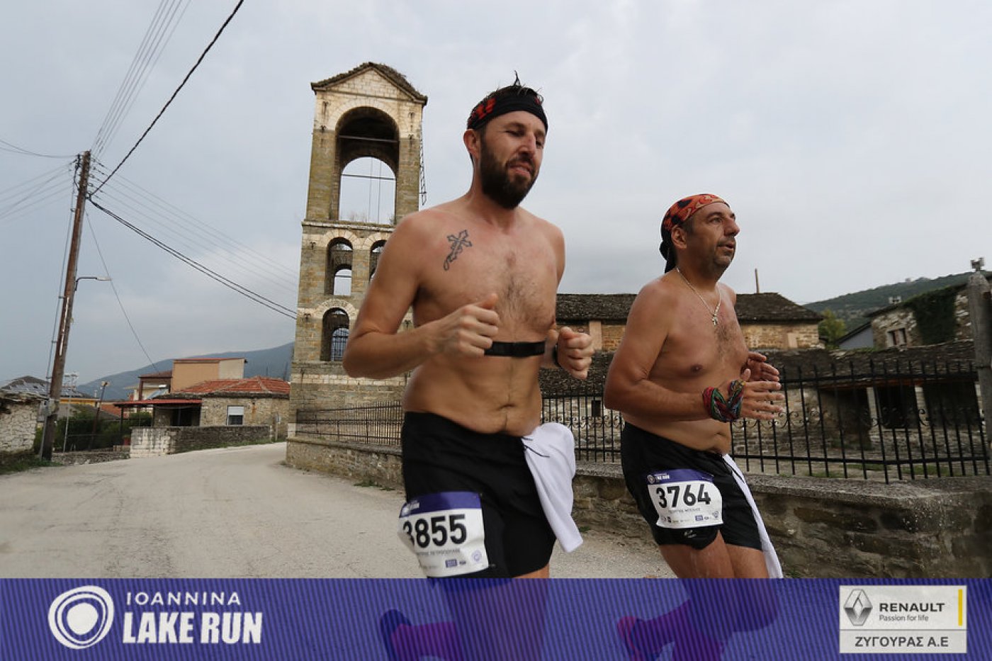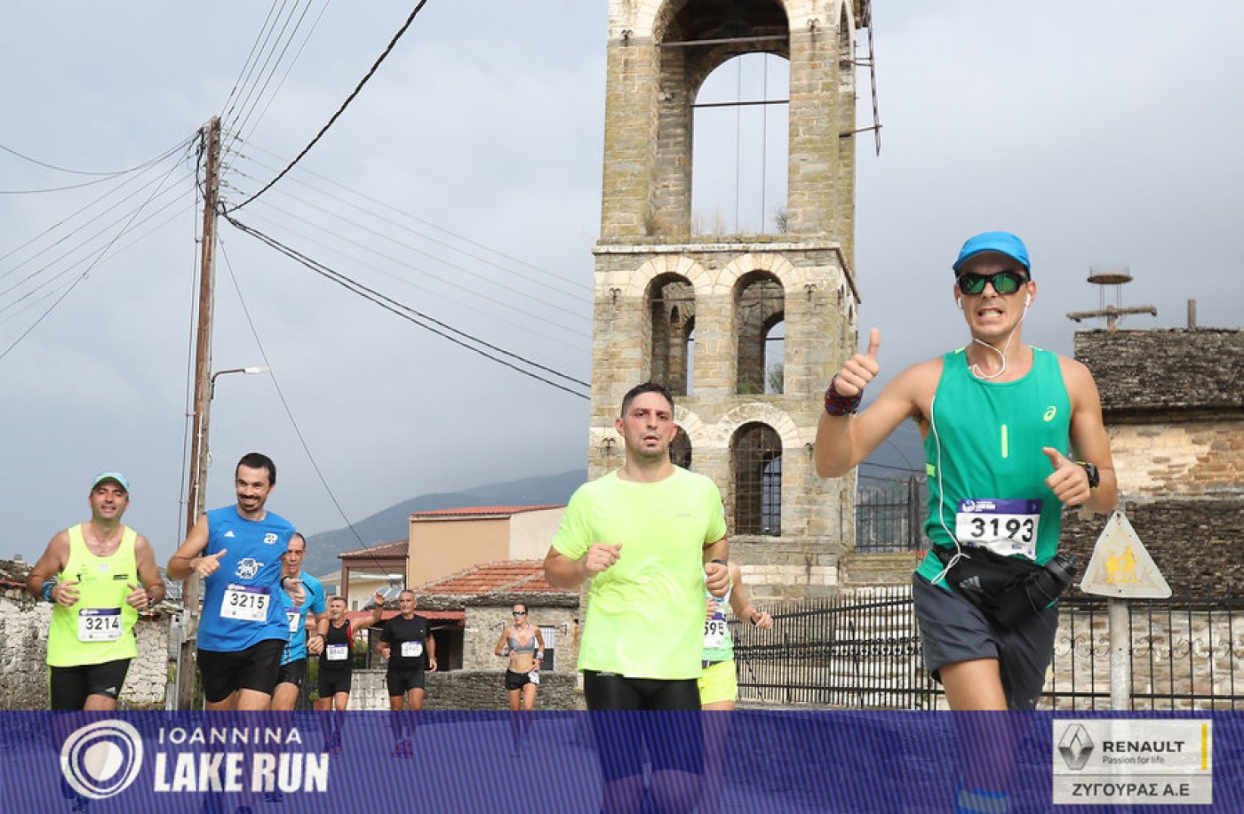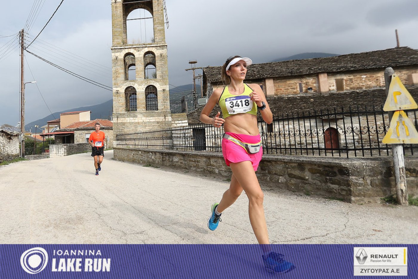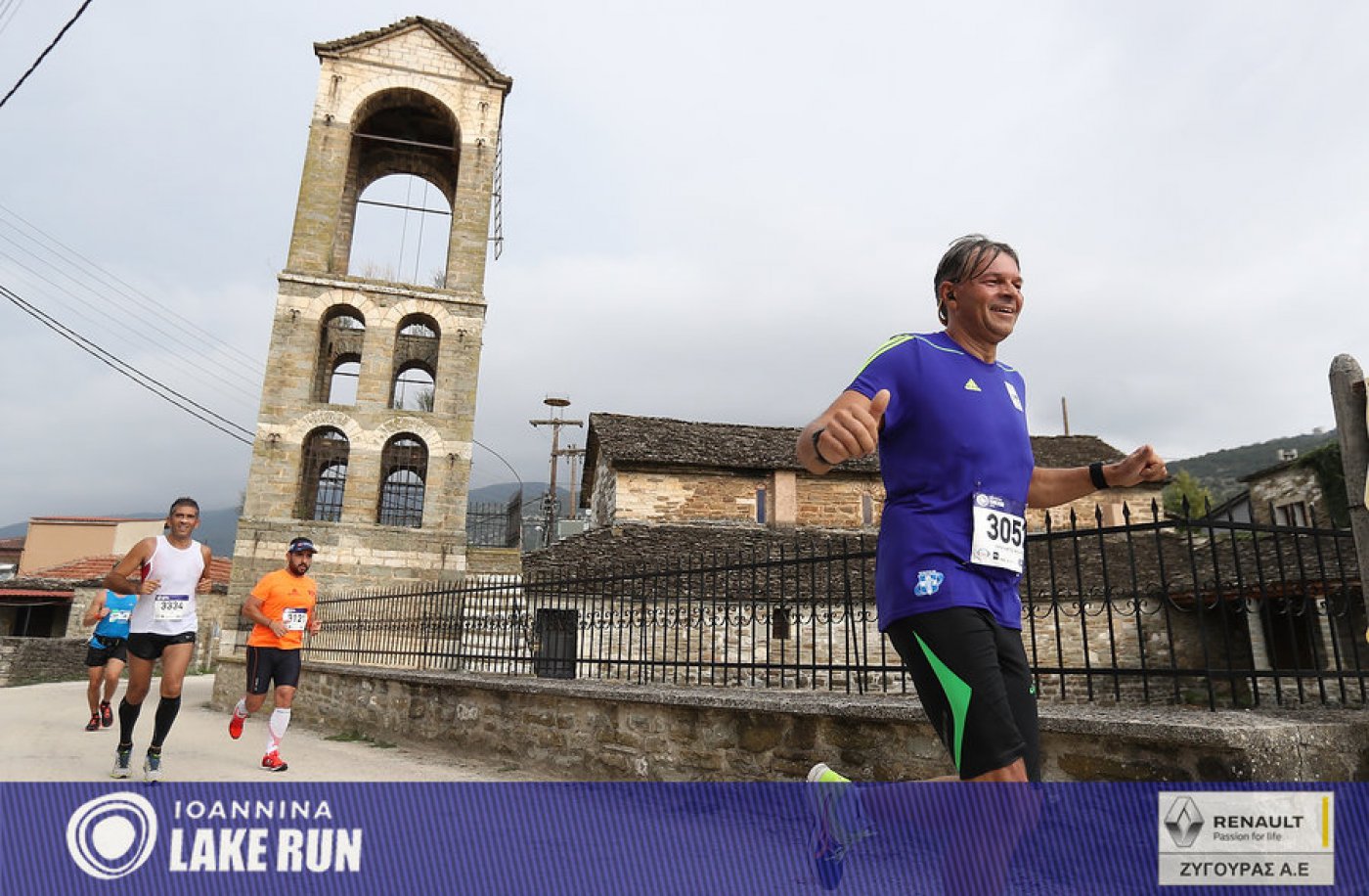 Το πέρασμα των δρομέων από τον παραλίμνιο οικισμό των Λογγάδων και το καμπαναριό της εκκλησίας της Κοίμησης της Θεοτόκου. Εικόνες από τη διαδρομή έξω από τα χωριά της Βασιλικής και της Κατσρίτσας έως την είσοδο στον παραλίμνιο πεζόδρομο-ποδηλατόδρομο.